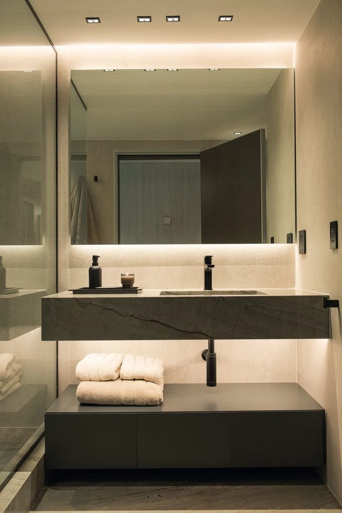 En el baño chico, piso y mesada con bacha se engaman en mármol Maximus Black, mientras que las paredes llevan placas de Laminam Pietra di Savoia (todo de @calellomarmoles). Inodoro inteligente de la firma Toto y grifería Axor Urquiola para Hansgrohe (@folkdegner).