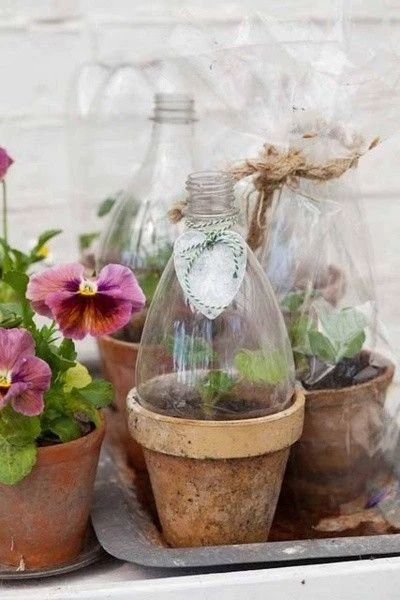 También podés colocarles alguna lona de plástico o tela especial para resguardarlas y por qué no crear con tus propias manos un mini invernadero con botellas para aquellas plantas pequeñas.