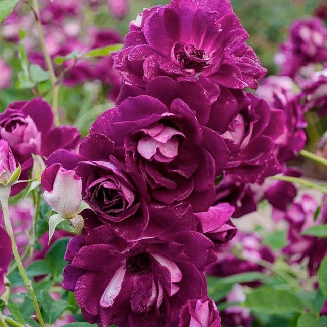 Característica principal: imponentes rosas dobles de color púrpura violeta aterciopelado y revés ligeramente plateado. Asociado con un rosal de flores blancas, sus flores se verán mucho más realzadas.