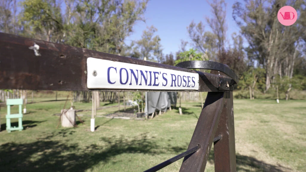 Comenzamos el recorrido por uno de los jardines que tiene Connie, que está escondido detrás de un cartel muy especial en una de las tranqueras. CONNIES’S ROSES se lee en letras azules sobre un fondo blanco. Si bien a simple vista parece un elemento más, esconde una historia muy romántica…