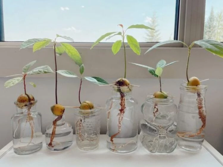 Lo ideal es apostar por un recipiente de la medida del carozo. La punta más angosta debe estar mirando hacia arriba. Podés usar 3 escarbadientes para que lo mantengan a flote. (Solo la mitad del carozo debe quedar sumergido en el agua).