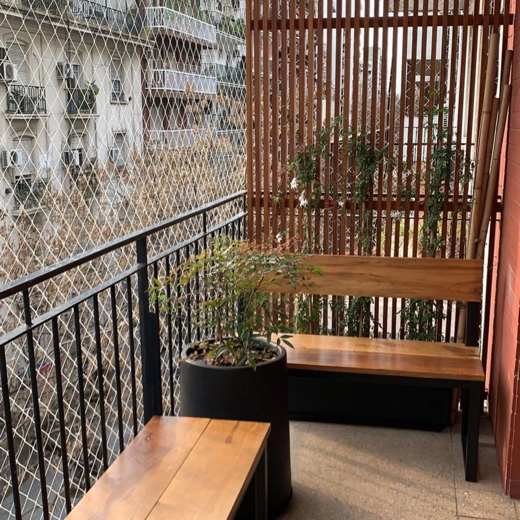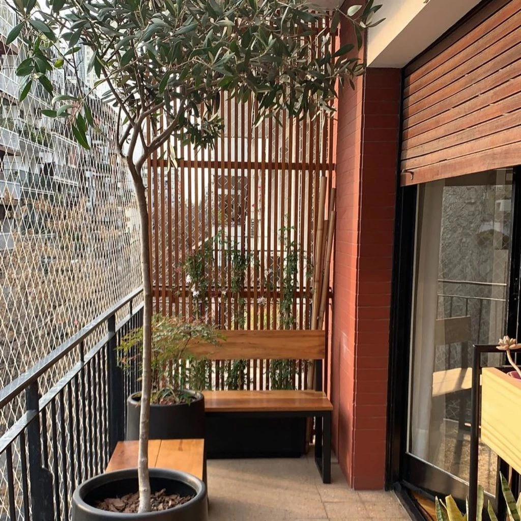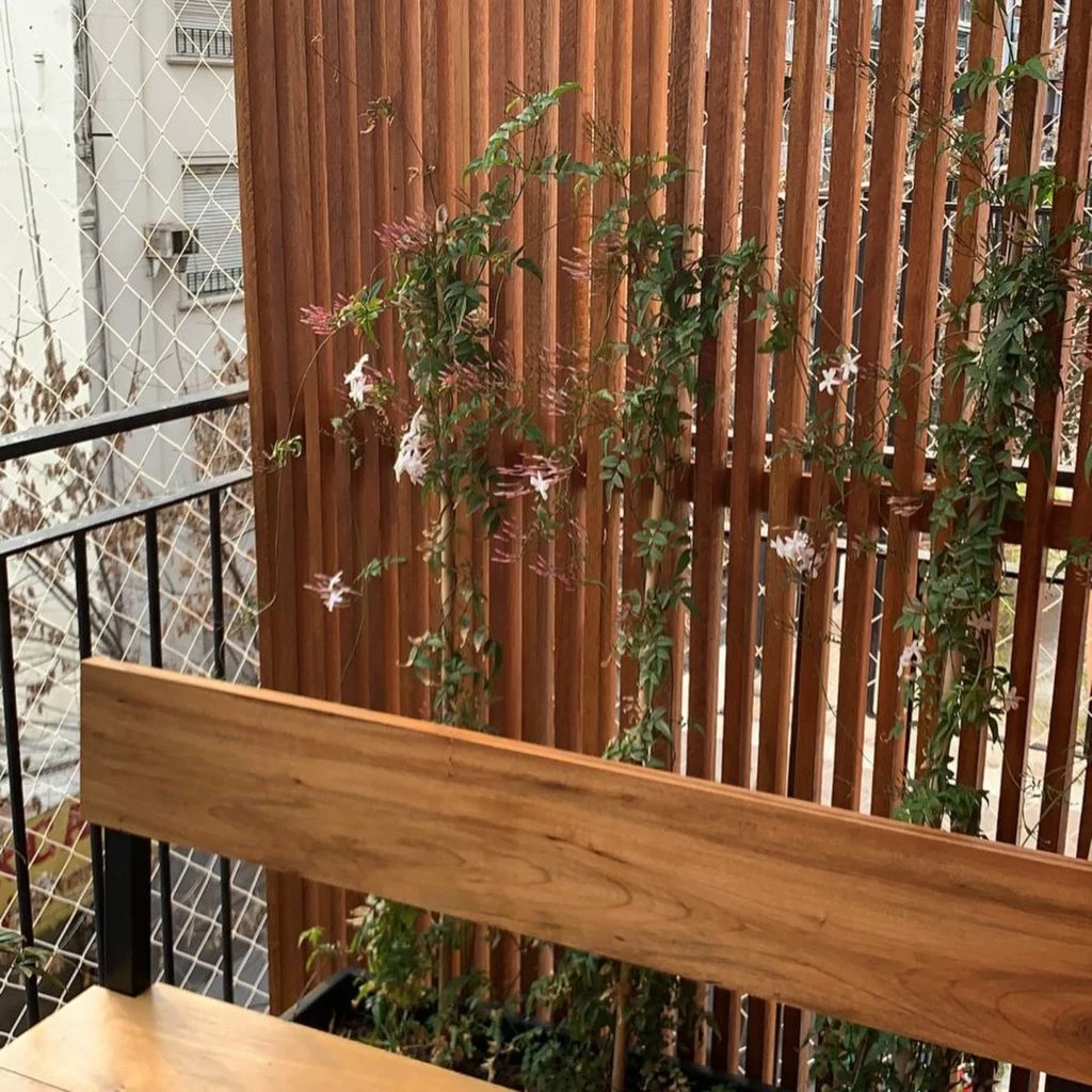 - Para tener más privacidad, en ambos extremos del balcón colocamos paneles verticales de madera.