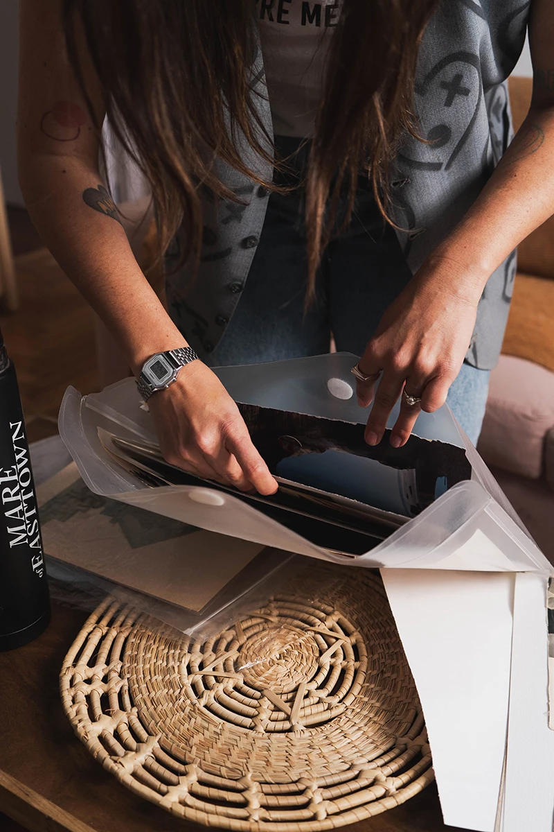 “Este es mi Cluttercore… No es un set de Barbie sino un espacio para la creatividad”, cuenta Marou Rivero, junto a su gato Vicente, y en su mundo privado que incluye su propio altar -en la biblioteca “en estado arcoíris” de todas las cosas- y su lugar de trabajo y placer: el escritorio rosa laqueado con el que siempre soñó sobre el que apoya apenas una laptop vestida de stickers o desparrama sus figuras recortadas y organizadas por colores (monocromáticos) para armar los collages que guarda en sobres y folios, o que exhibe en su propia galería de la pared que se luce mejor abriendo la puerta, saliendo de su casa y mirándola desde el pasillo.