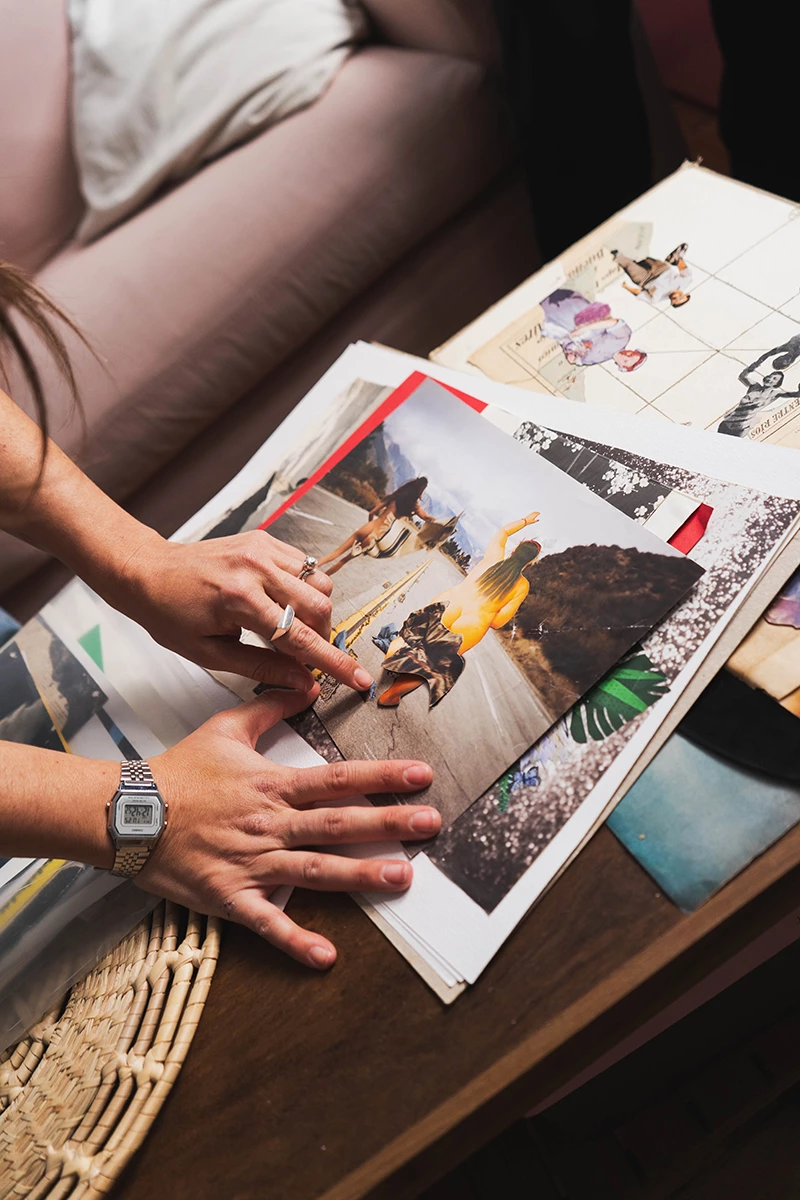 El recorrido por el universo privado y visual de Marou Rivero empieza apenas se atraviesa la puerta, y lo primero a la vista es una pared tipo tablero de Pinterest con imágenes testigo y expresión de diez años como collagista; autodidacta primero, hoy tallerista. Todas enmarcadas. Y sobre algunas de ellas, va la bicicleta plegable rosa, a juego con el escritorio bajo la ventana.