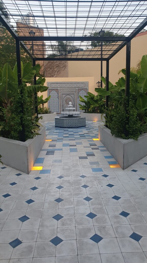 Su diseño cuenta con caminos geométricos que rodean jardines con palmeras, especies frutales y aromáticas, culminando en la fuente principal, de estilo marroquí.
