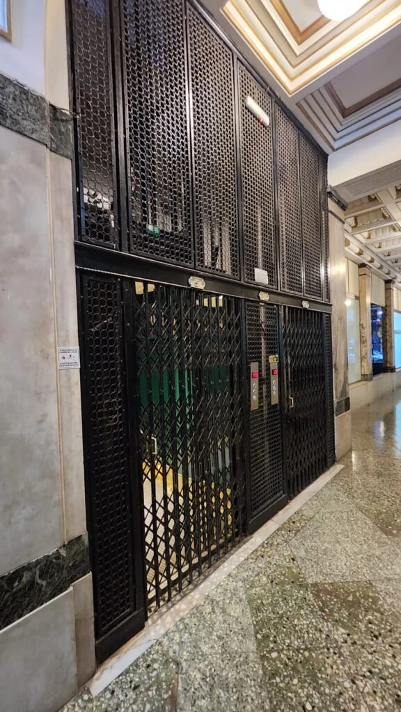 Está iluminado con farolas de bronce y cristales biselados originales. Sobresale, también, un gran sobrerelieve dorado del cuerno de la fortuna, o de la abundancia.
