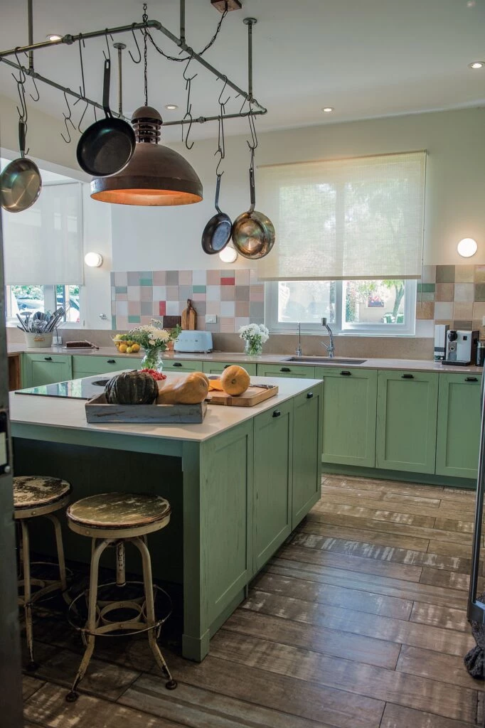 La nueva cocina de Maru Botana propone entonces paredes en un mix de cerámicos artesanales en colores pastel (Carabath), mesadas y alzadas en piedra sinterizada Technistone (Baremes) y pisos de porcellanatos símil madera (SBG). Todo el amoblamiento es de la línea Celebración (De Otro Tiempo), en madera laqueada de un color verde que recuerda a las cocinas de campo.
