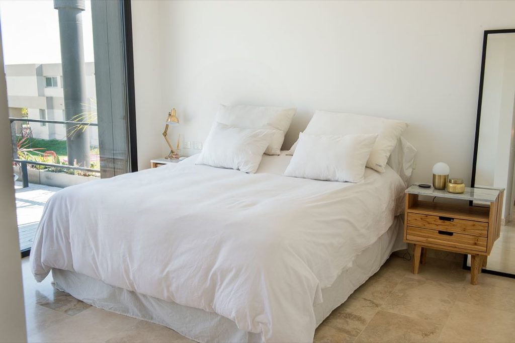 El dormitorio principal acomoda un sommier de 180 x 200 cm (Rosen) con dos mesas de luz fabricadas a medida en madera de paraíso y Carrara, veladores con diferentes diseños en color bronce (ambos de Palta Furn) y espejo de 180 x 60 cm con marco negro mate. La ropa de cama y los almohadones llevan fundas de algodón y tussor blanco.