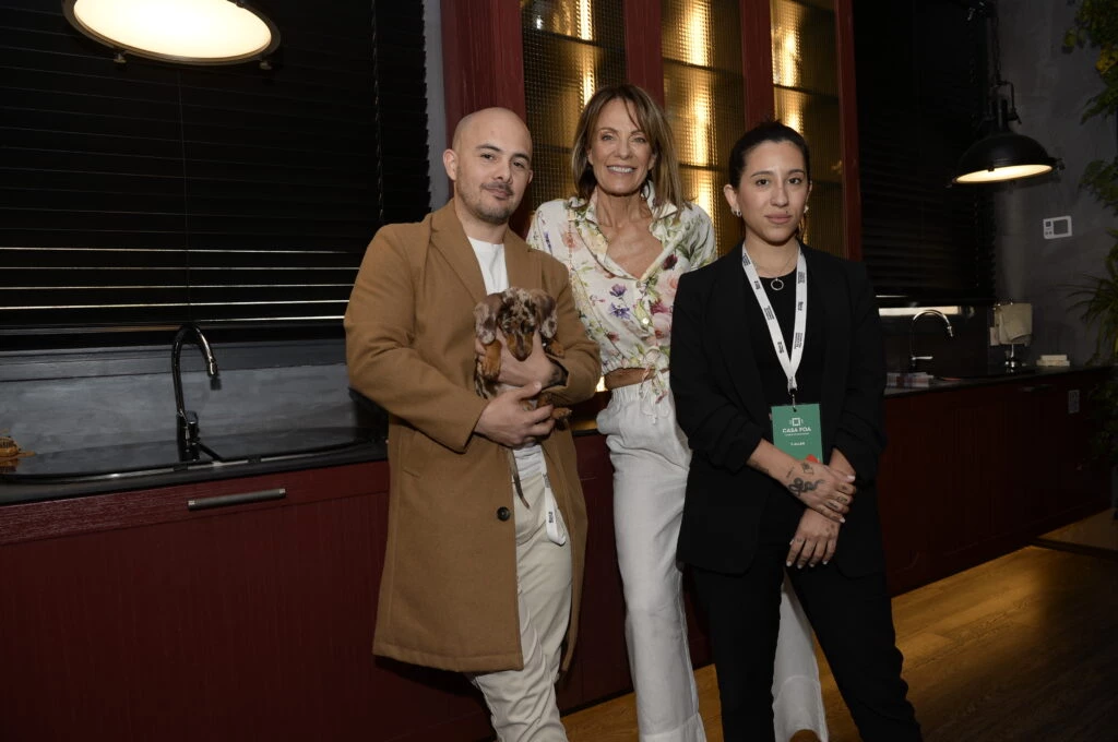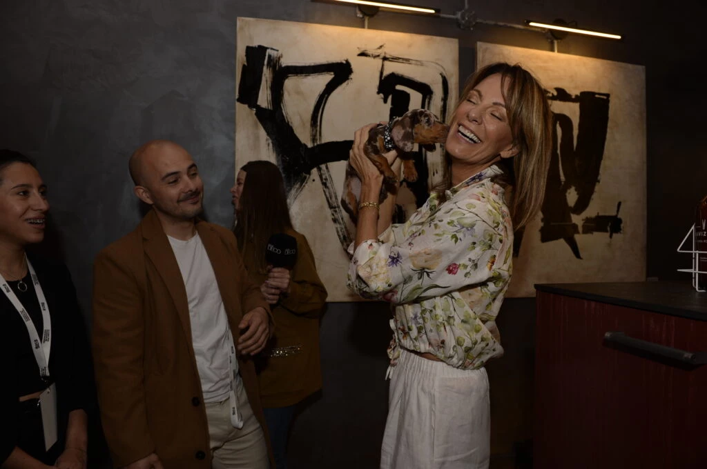 En este espacio la modelo pudo charlar con la dupla de expositores, quienes le contaron cómo pensaron el diseño y la sorprendieron con un visitante de lujo: un cachorrito que se robó el corazón de Nequi.