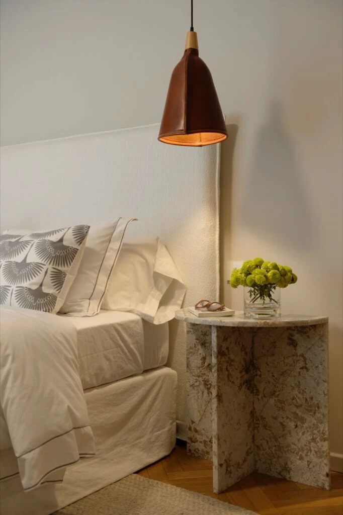 A los diferentes tipos de maderas y la amplia gama de enchapados, se suma ahora un material más exótico para este tipo de muebles: las piedras. Diferentes tipos de mármoles y resinas, se transforman en el material protagonista de estas mesas de luz diferentes, que combinan sus formas con los colores y dibujos de cada piedra. materiales nobles y de texturas: el respaldo de cama de boucle, la mesa de luz de mármol.