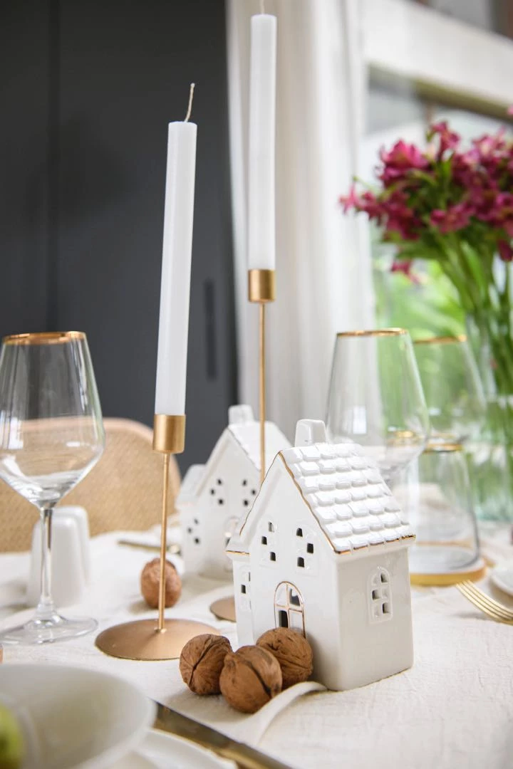 Como contraste, el el toque glam del dorado sobre las copas, los vasos, los candelabros dorados en distintos niveles con velas altas y las casitas de porcelana; y el bordó que asoma en las bellas astromelias en florero de vidrio.