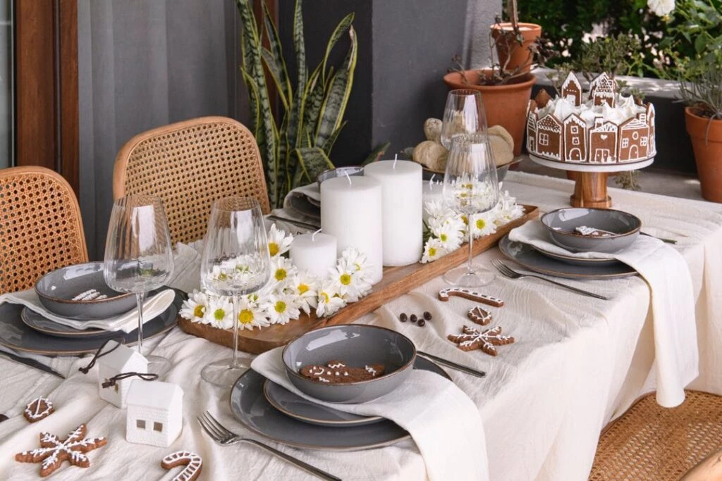 “Se me ocurrió armar una propuesta de mesa navideña adentro y otra afuera. La de interiores es de un estilo elegante, más sofisticado, donde se mezcla el blanco de la vajilla con toques de tonos bordó, como las astromelias, el vino y los higos. Y la exteriores resulta más natural, con una mezcla de velas, margaritas, madera, y el fondo de la naturaleza”