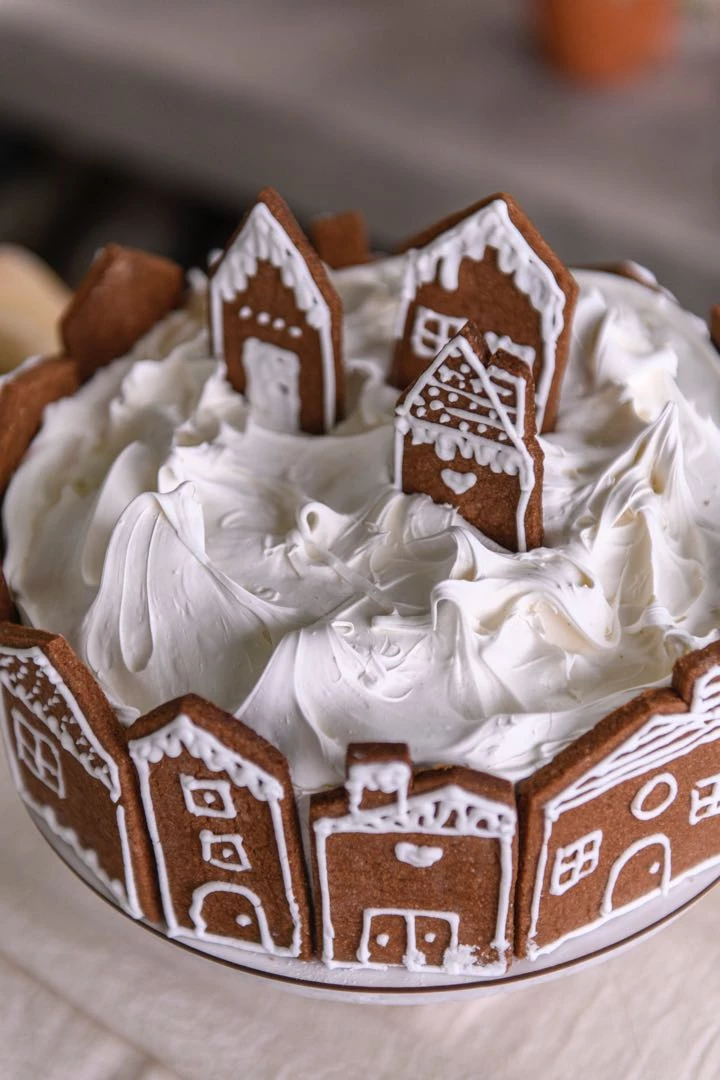 Clara Houssay eligió disponer una torta como foco del espíritu navideño de la mesa, y convocó a Jimena de Bake Your Dreams Cakes para ejecutarlo. La pastelera sorprendió con esta delicia con cookies de casitas y galletitas con hombrecitos de jengibre, estrellas navideñas, caramelos con forma de bastón y arbolitos.