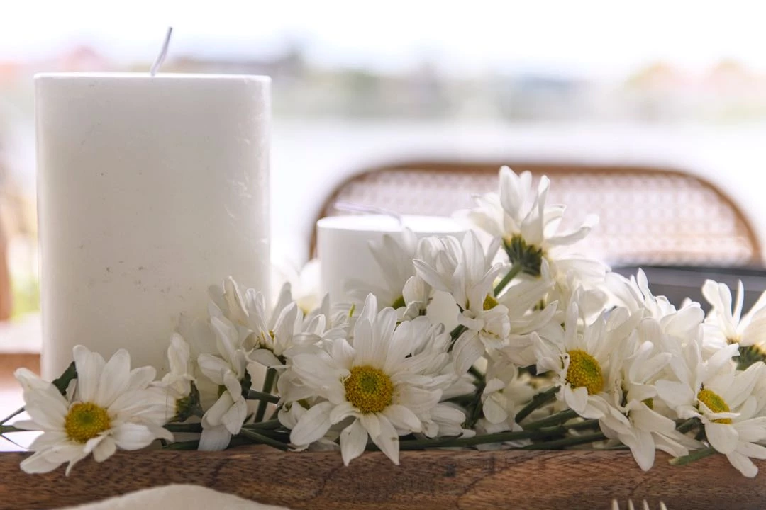El centro de mesa -preparado por Clara Houssay- se lleva todas las miradas, con una larga bandeja de madera de la India con velas en tres alturas y unas alegres margaritas.
