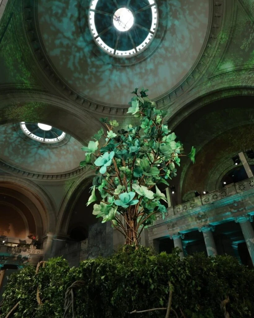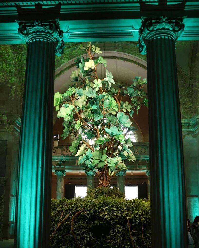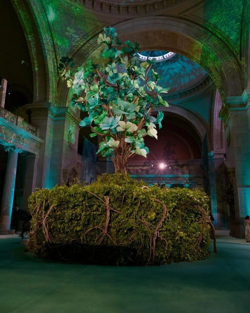Pero la pieza central de la Met Gala tenía que ser algo que uniera todo y reflejara su mágico sentido general. Así, un imponente árbol de tela suavemente iluminado se alzó en el centro del Gran Salón.