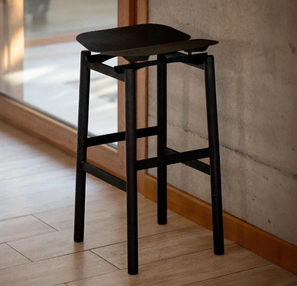 La silla “Haiku” de Ernesto Gabriel Torriano, reinterpreta la silla clásica con tres apoyos visuales, madera recuperada, estructura desmontable y diseño liviano para recepción.
