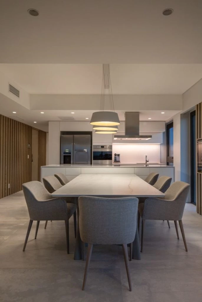 El comedor y la cocina integrada apuestan a la tendencia del varillado, mostrando un revestimiento de varillas inclinadas enchapadas en madera de roble fumé en distintos sectores.