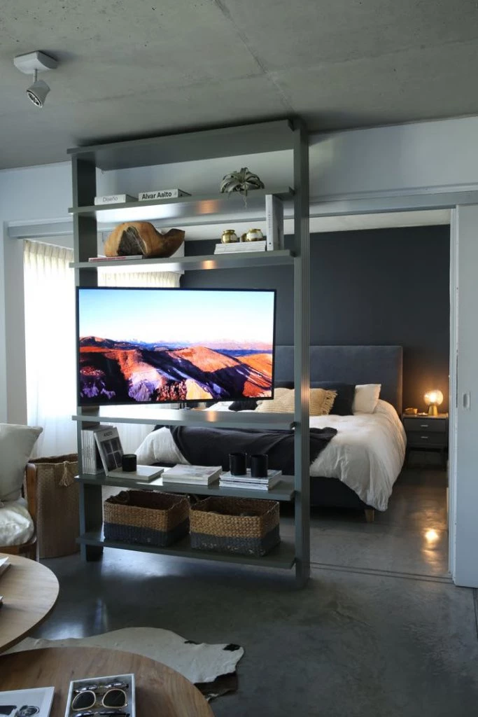 Algunos muebles pueden diseñarse a medida y funcionar como divisor, biblioteca, lugar de guardado y hasta 'rack TV'.