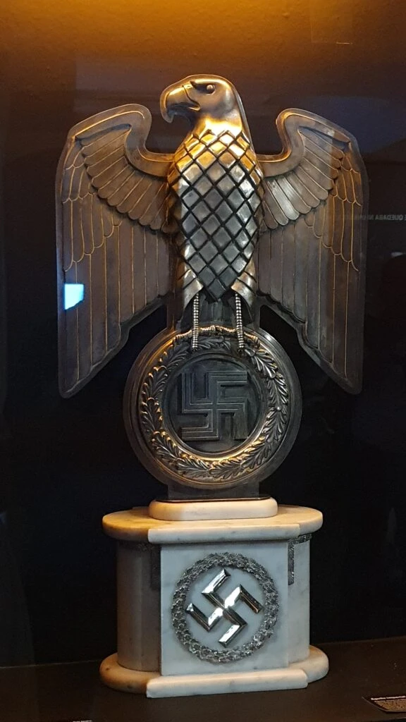 Llama la atención un águila imperial de la época del nacionalsocialismo. Se trata de un objeto incautado por la Justicia que estará en guarda hasta la sentencia de la causa a cargo de la jueza Sandra Arroyo Salgado.
