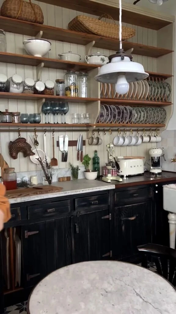 En el video también se puede ver una pared íntegramente destinada a guardar la vajilla y parte de los electrodomésticos: desde ollas y frascos, hasta platos, vasos y otros utensilios.