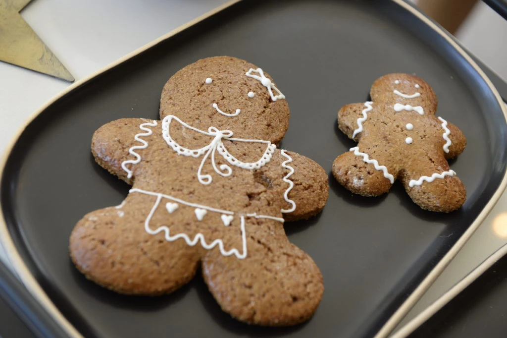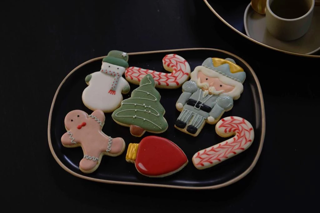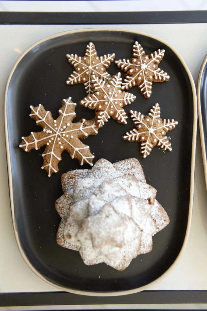 Para sumar magia navideña al brindis y acompañar el café, el decorador Sebastián Salazar encargó pastelería alemana (LINDEN PASTELERIA). Se seleccionó vajilla negra (SALAZAR CASA) para realzar visualmente la pastelería.