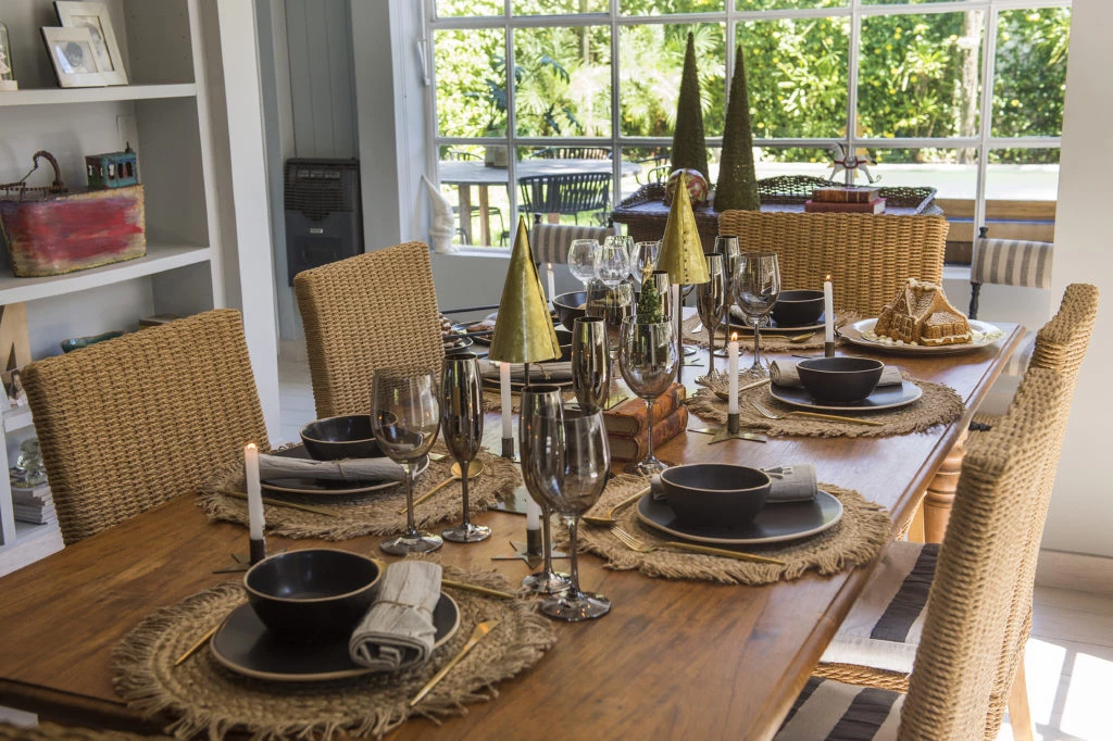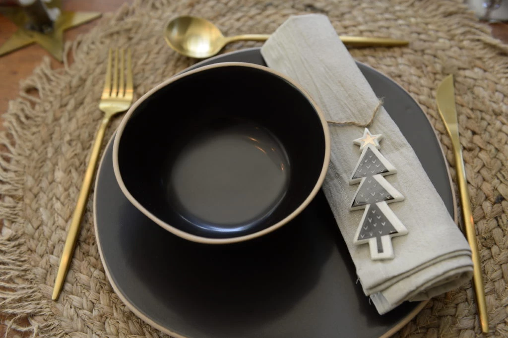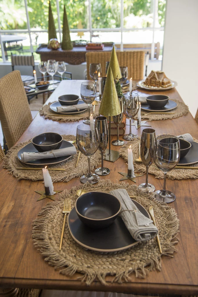 Se dejó a la vista lo rústico de la mesa de campo existente y se sectorizó cada lugar con individuales de yute que sirven de base para la vajilla irregular negra de cerámica, junto a la cual se agregaron adornos de arbolitos de porcelana como servilleteros.
