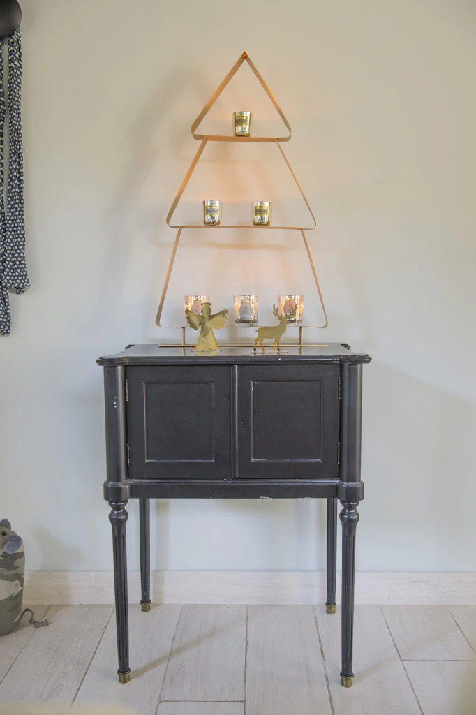 En la zona de paso, sobre un viejo cubiertero laqueado negro se ubicó un árbol de hierro dorado que sirve de portavelas junto a un ángel y reno del mismo material (todo de SALAZAR CASA).
