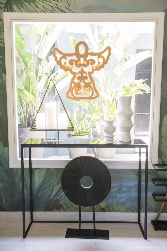 A la consola de hierro ubicada en el hall de entrada se le sumó un portavelas de hierro dorado mezclado con la decoración existente y en la ventana se colgó el ángel de fieltro (todo de SALAZAR CASA).