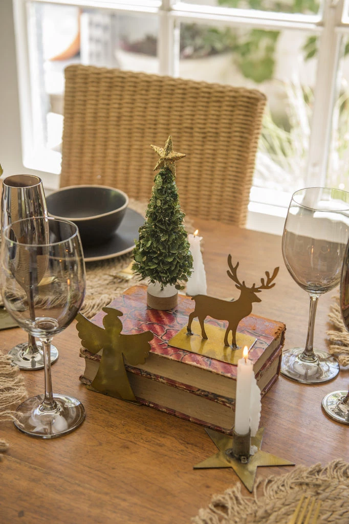 El toque original lo aporta el centro de mesa creado con dos libros antiguos rojos más el sujetalibros de angelito y reno que combinan con dos arbolitos dorados laterales y el miniarbolito verde (todo de SALAZAR CASA).
