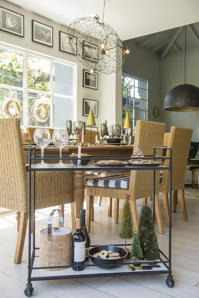 Para descomprimir la mesa se sumó un carrito de hierro y porcelanato que también tiene su toque navideño, con un trío de arbolitos diferentes (todo de SALAZAR CASA).