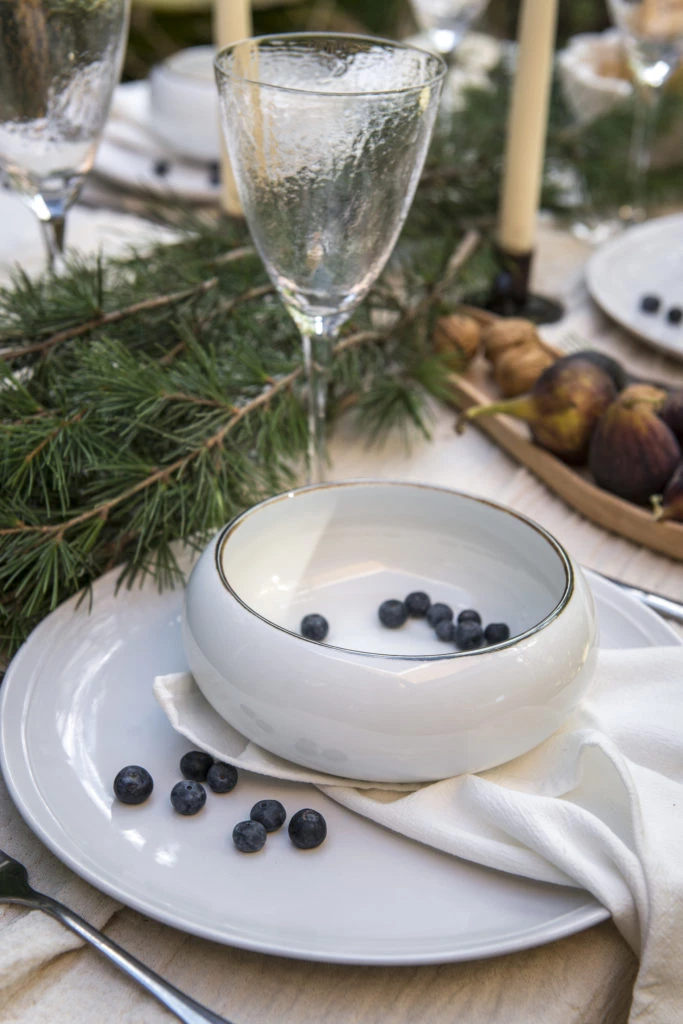 Copas de vino transparentes, candelabros de metal con velas en crudo, una jarra de agua color ambar y dos bandejas de madera orgánica con frutos, higos, almendras y nueces agregan el toque cálido y natural.