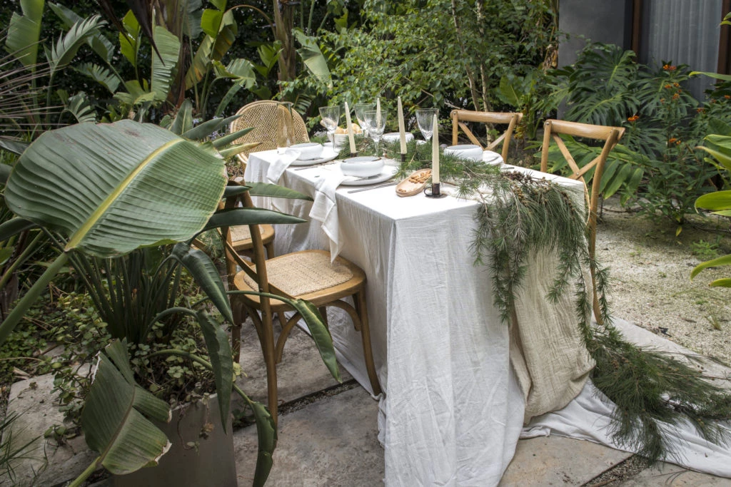 Visten la mesa telas livinas, un mantel de lienzo blanco con arrastre y superpuesto otro texturado de gasa natural, las servilletas de liezo en crudo (todo de @compania_nativa).