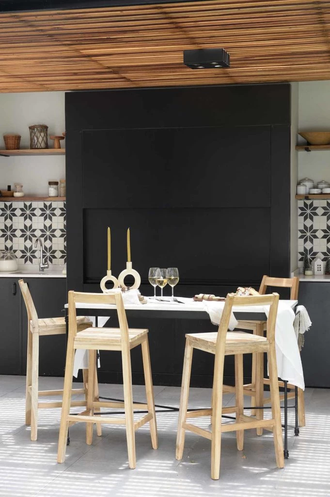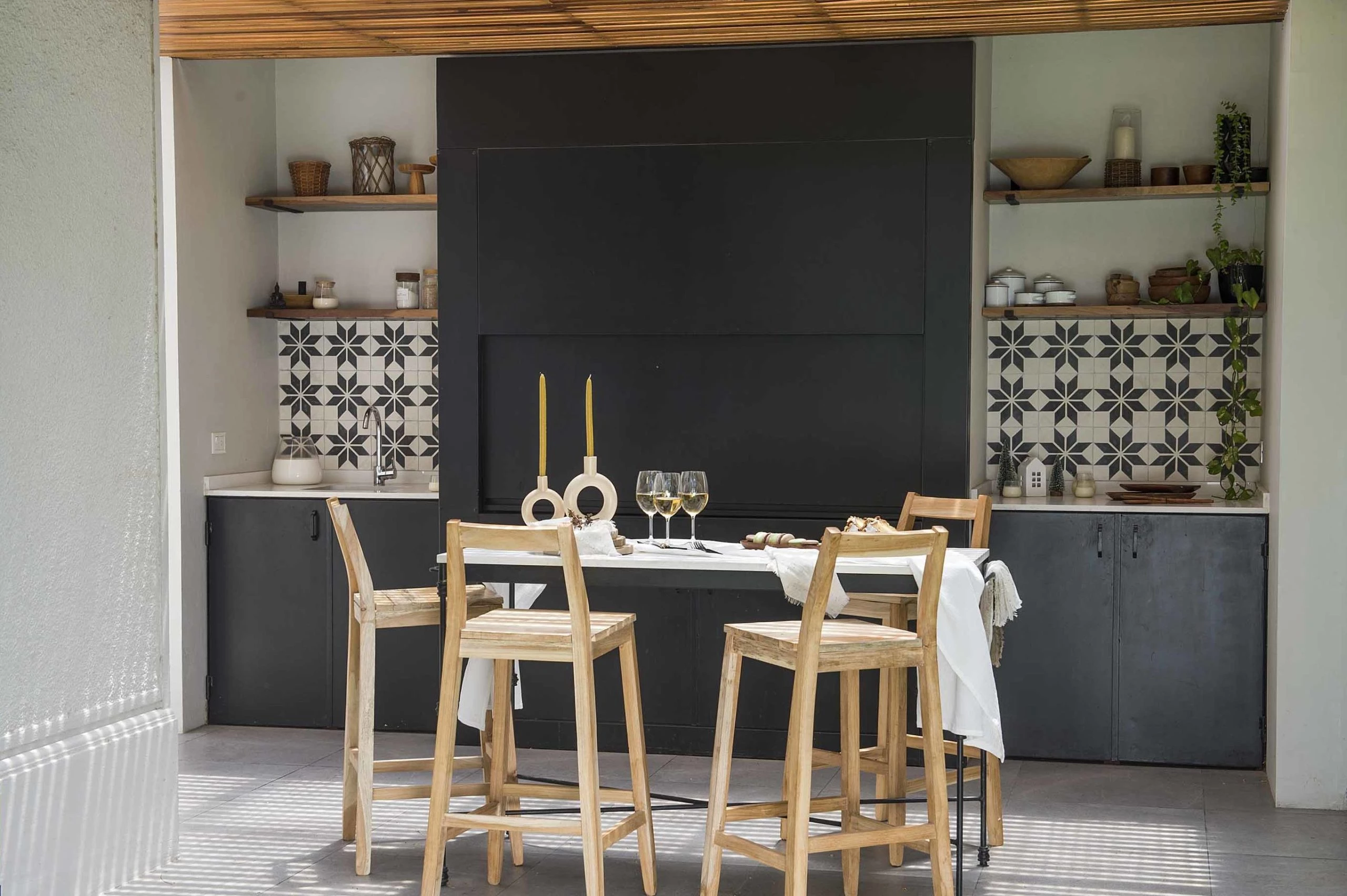 Bajo una pérgola de hierro y madera, esta propuesta canchera y descontracturada se improvisó con una mesa alta de mármol (@verdementa_deco) y con cuatro banquetas de madera (@manada_almacen).