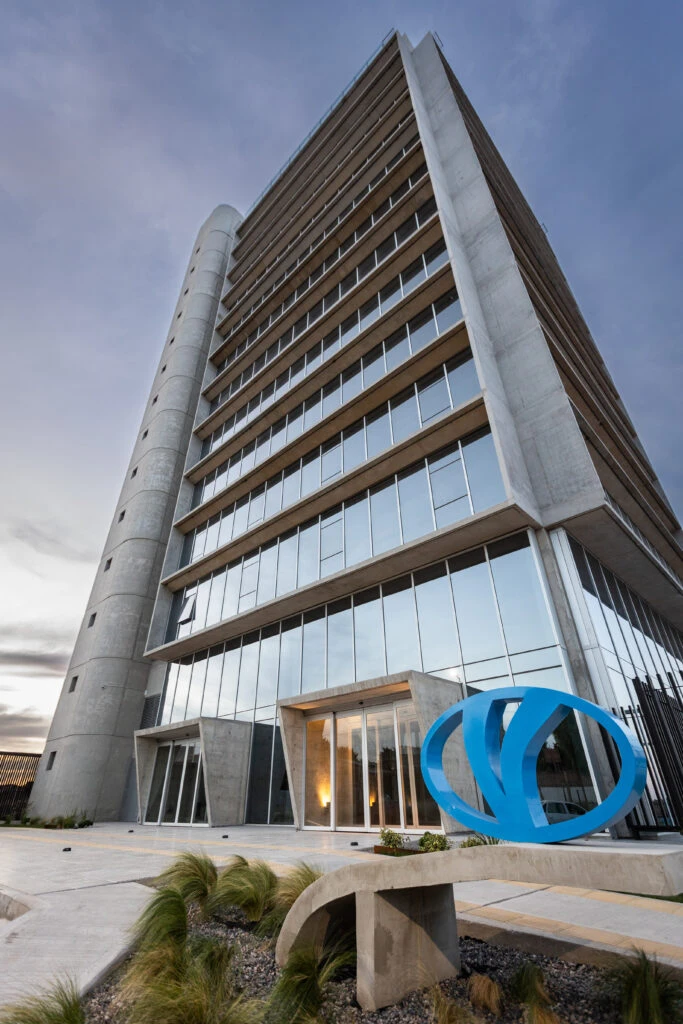 Las líneas curvas dan fluidez en circulaciones y lugares de paso, aportan calma y dan sensaciones de continuidad. Mientras el mobiliario negro y el tono azul de las alfombras remiten al tono institucional de la empresa añadiendo elegancia, el detalle dorado de la luminaria aporta un toque de sobriedad. Este proyecto fue llevado en conjunto entre Marcelo Mazza y Cynthia Piazzoni.