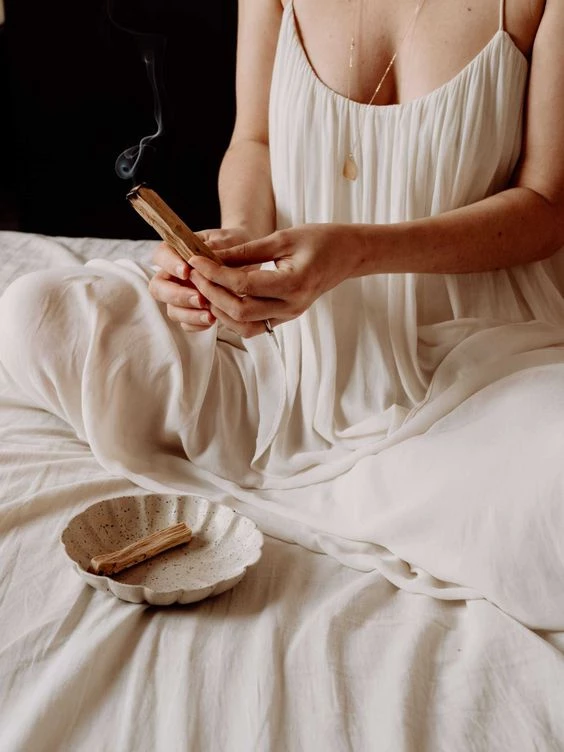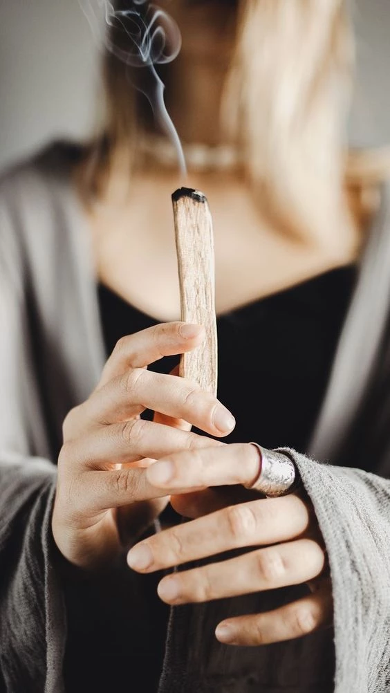 Encendé un trozo de palo santo para sahumar todo el cuerpo o el aura, pasándolo alrededor mientras se rechazan las energías negativas y se fortalece la protección espiritual.