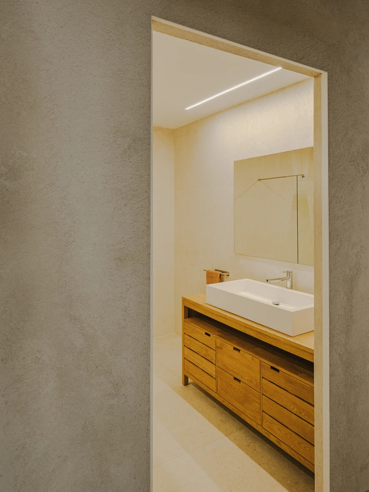 En esta zona central y en forma de isla se organiza el núcleo de baño que separa la zona común de cocina y sala de las habitaciones, dándoles privacidad a la vez que genera el espacio de lavandería y despensa en forma de amplio pasillo equipado.