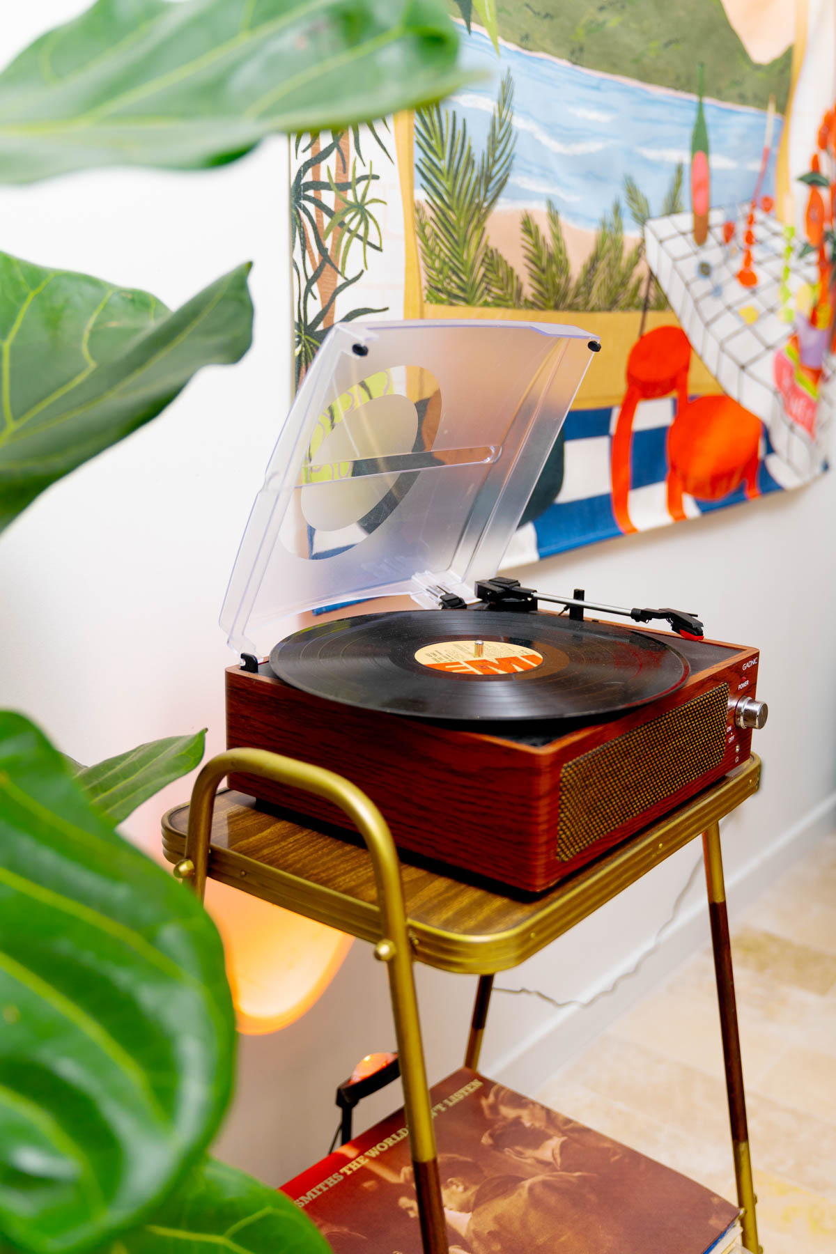 En el comedor el protagonista es el tapiz de Felpa Home -la primera marca para la que trabajó y lo sigue haciendo- y en el espacio de la mesa también se destacan una sunset lamp, y un tocadiscos acostumbrado a girar entre plantitas.