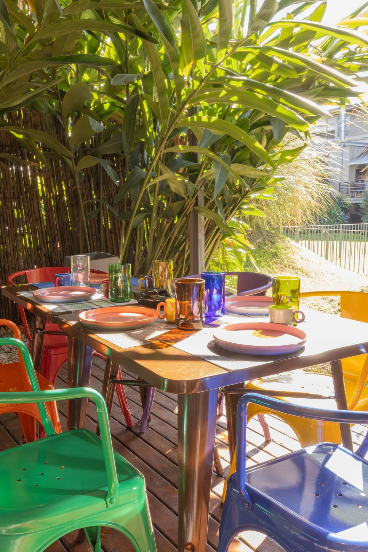 Más allá, la vista otra vez se expande frente al entorno -la galería con parrilla y rodeada de vegetación- y se detiene en los detalles: en la mesa exterior ninguna silla es del mismo color que la otra –“mi silla es la amarilla”, indica Jesus- y está servida lista para recibir, con individuales, platos y vasos, todo de diferentes colores.