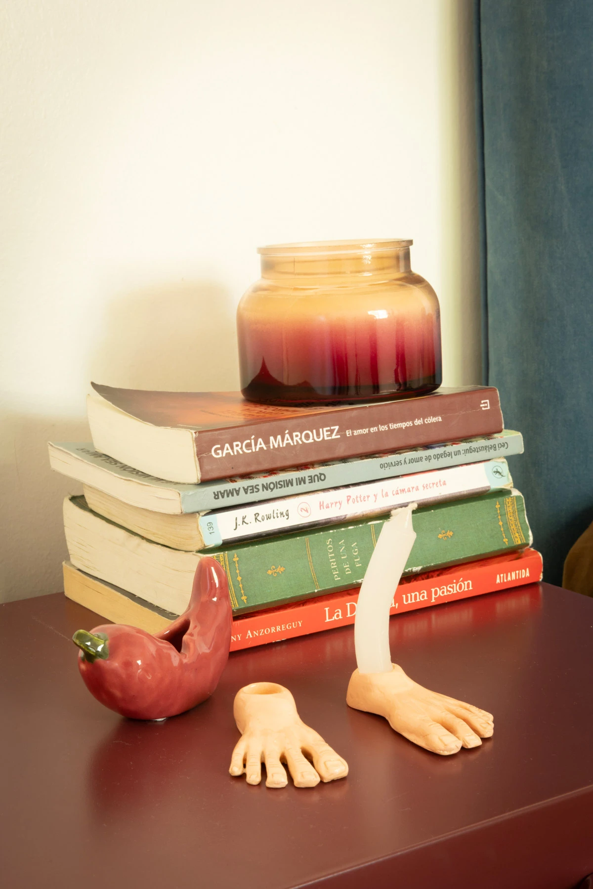 Así son las cosas en la casa/depto de Jesus. Tras la experiencia de la primera vista del sillón azul todopoderoso y omnipresente, quedan y persisten los detalles: la mesa ratona color amarillo con sus libros fetiche arriba (uno sobre la historia de adidas y el otro, una biblia de joyería en el rap) más dos ceniceros -de ají y berenjena- como las dos mini botas texanas -pimentero y salero- junto a la tele y sobre el aparador, del que “chorrea” un huevo de cerámica surrealista.