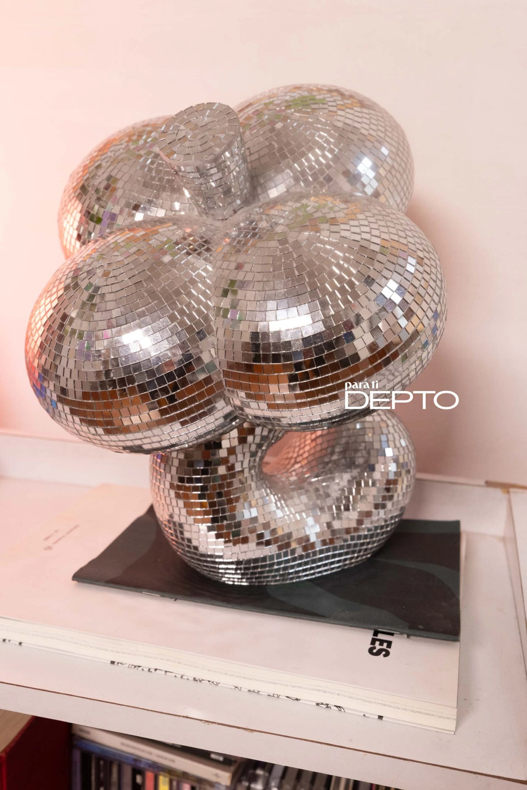 La música también inspiró otro fetiche del depto: la escultura de espejos hecha por Vero, con forma de flor psicodélica que llena la casa de una vibrante atmósfera disco.