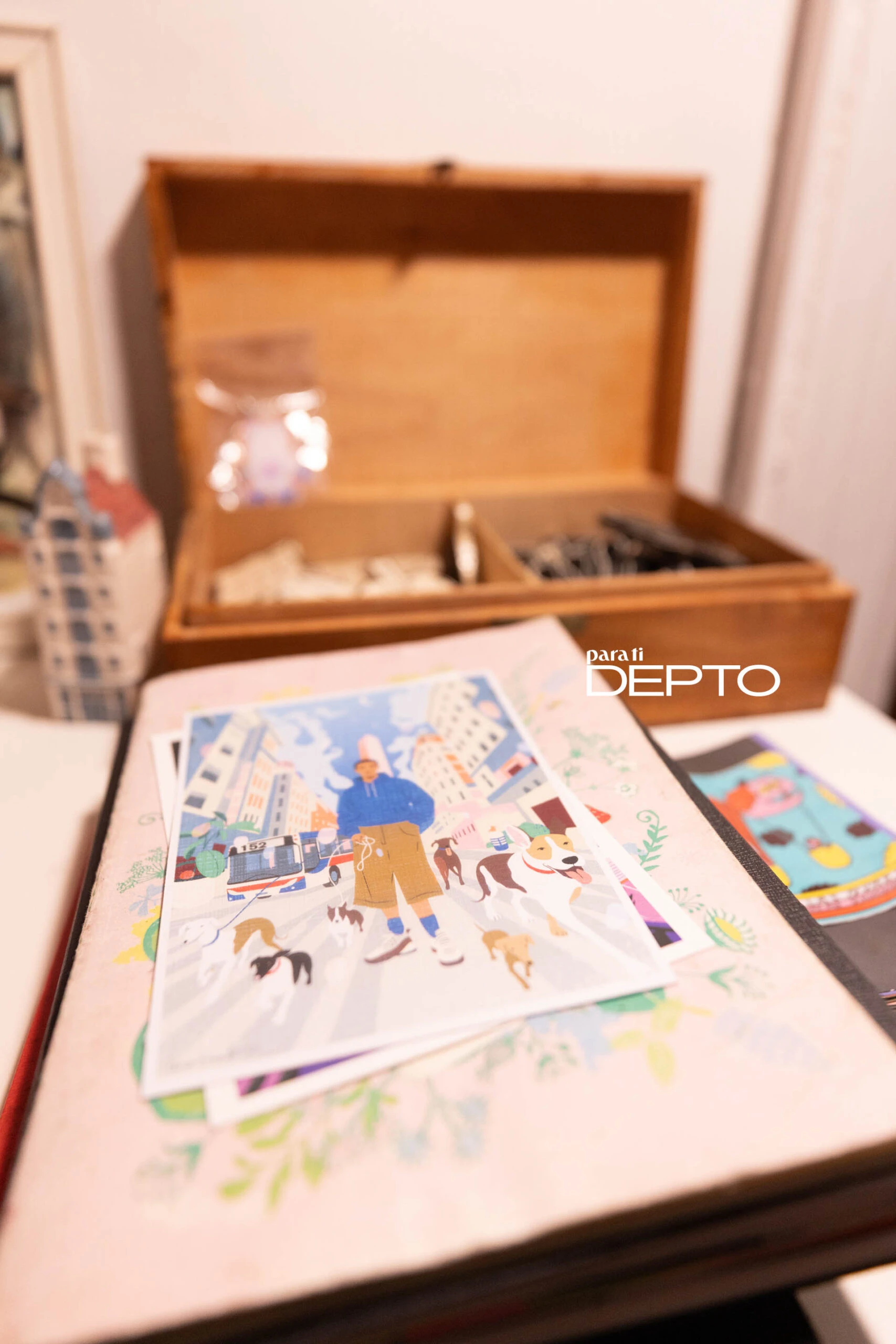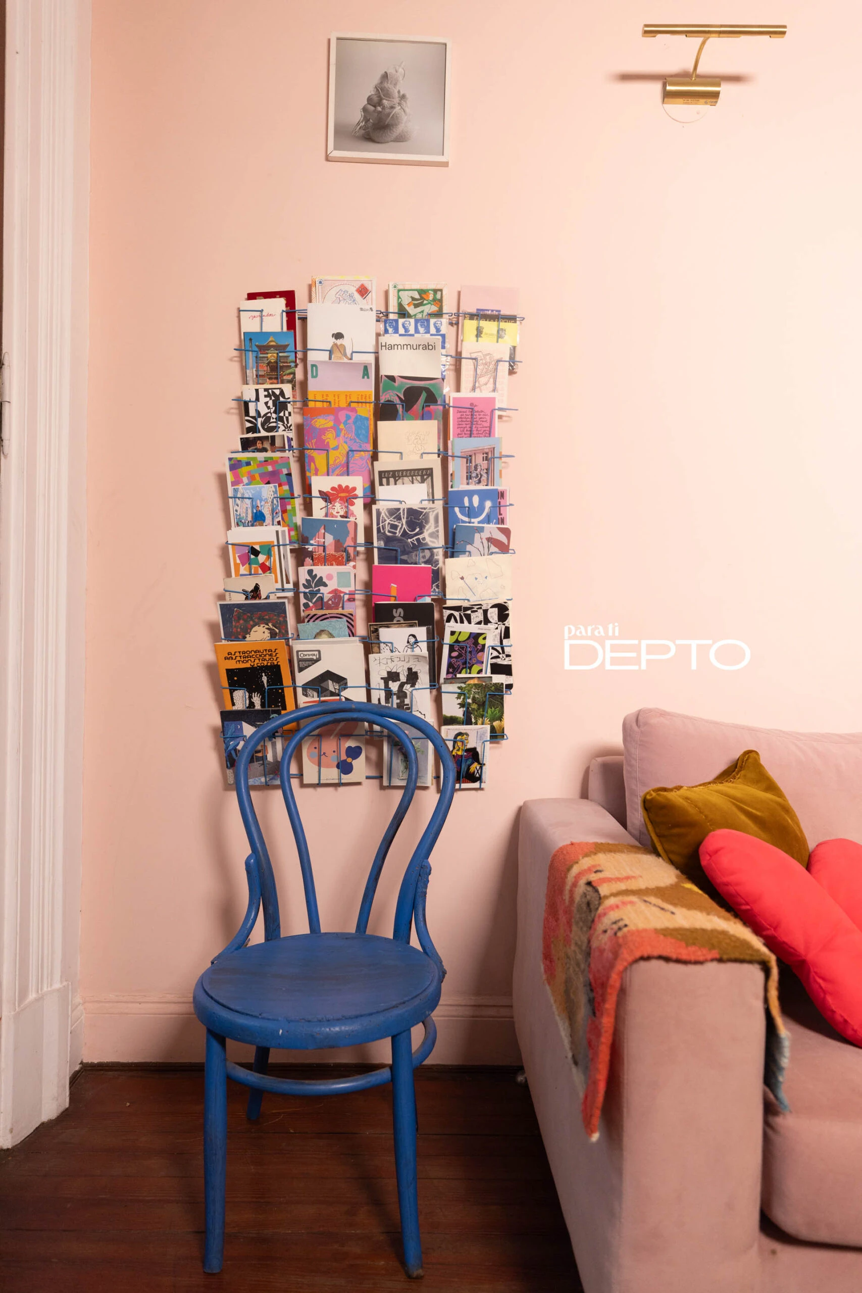 Junto a ella, un rack tipo exhibidor de postales colgado en la pared (comprado online) exhibe –como en un revistero- fanzines y postales de amigos y artistas. Y en el medio de la escena sitcom porteño de la sala de estar, hay una mesita ratona con libros que convocan a anfitriones e invitados a un lugar de encuentro inmediato con el arte, la lectura y la inspiración.