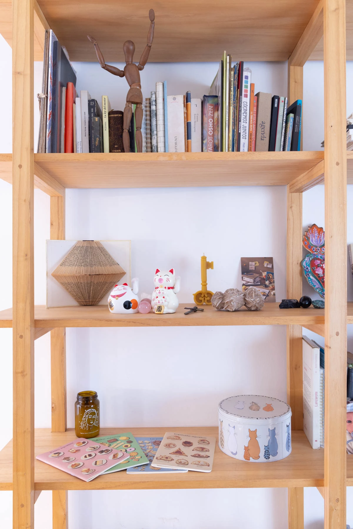 Esas cosas nuevas y esas cosas heredadas -“todas las chucherías que tengo ahí”- coinciden, se mezclan y arman una encantadora escena en la biblioteca, inconfundiblemente suya, con todo a la vista.