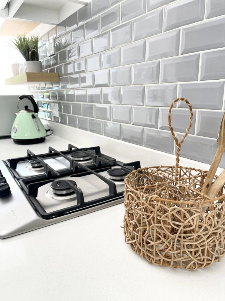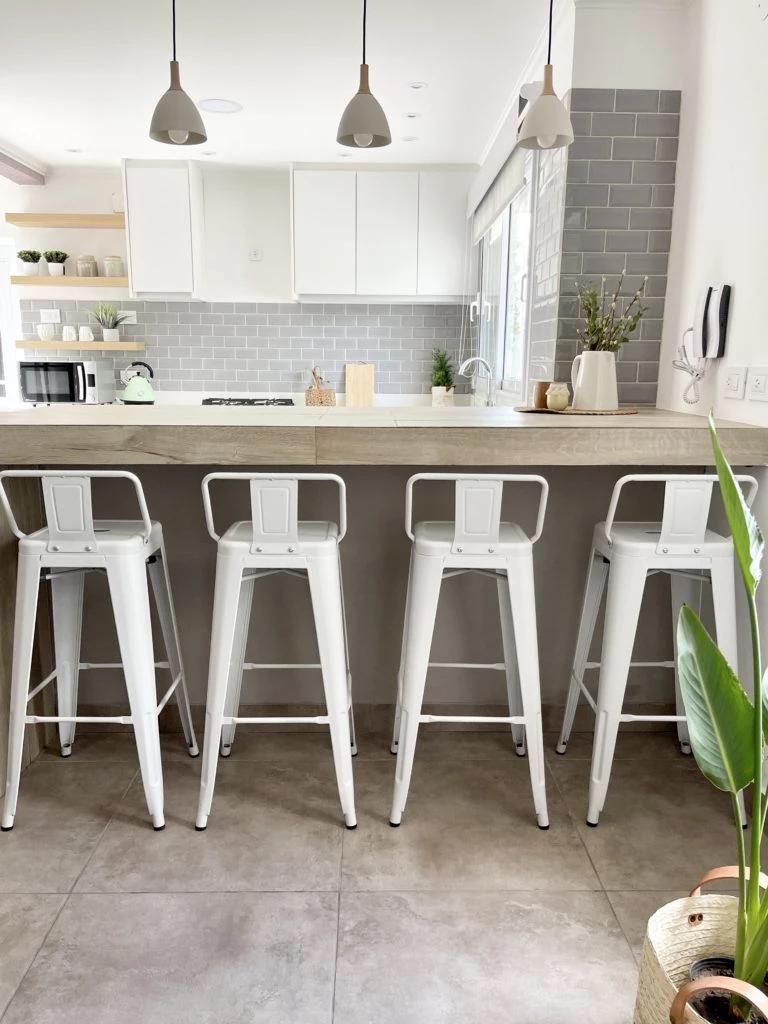 "Se utilizaron azulejos subway en color gris y junta casi blanca para destacar cada unidad. En cuanto al mueble, la idea fue coronarlo con dos extremos que nos dieran calidez: por un lado -en el sector electrodomésticos- un box en melamina acabado madera y unos estantes flotantes acompañando esa estación; por el otro -con la mega barra- madera, pero esta vez en otro formato y terminación", concluye Ornella.