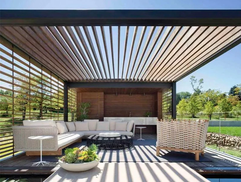Se trata de un tipo de estructura cuyo diseño está pensando para aprovechar al máximo las condiciones climáticas del lugar de instalación. A través de gruesas láminas orientables que actúan como techo, se protege y regula la temperatura de manera natural. Se pueden incorporar en patios, jardines y terrazas.
