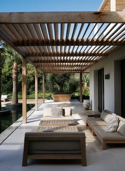 "Este tipo de pérgolas están construidas con especies tropicales, resistentes a la humedad y el sol de la intemperie: lapacho, incienso, curupay, cumarú o angelim, entre otras. Su estructura está compuesta por columnas vinculadas por vigas y cabios. La terminación rústica y natural de la madera permite crear un ambiente orgánico con los espacios exteriores", explica Laura de Tolder.