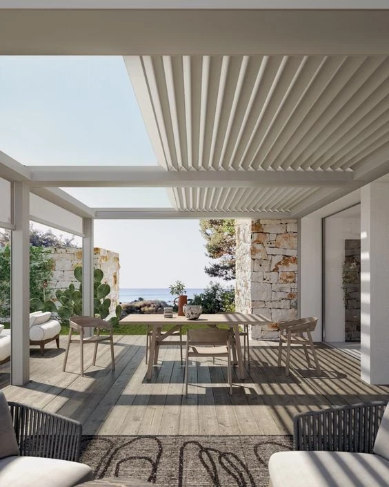 A través de gruesas láminas orientables que actúan como techo, esta opción protege y regula la temperatura de manera natural. Esta es la principal característica que la diferencia del resto de las pérgolas tradicionales.