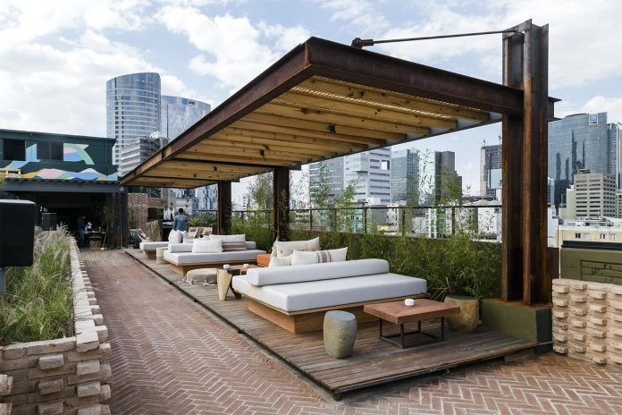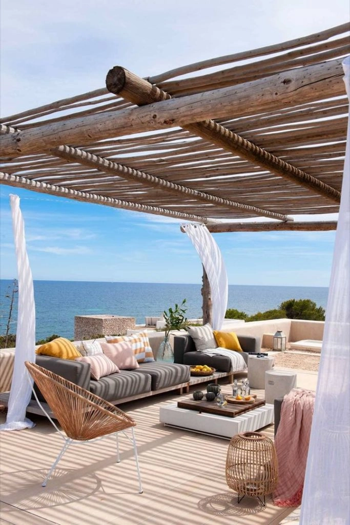 En esta propuesta, una estructura de material le da contención a unos tirantes de madera que forman la cubierta y regalan juegos de luces y sombras sobre una pequeña terraza con espíritu chill out.