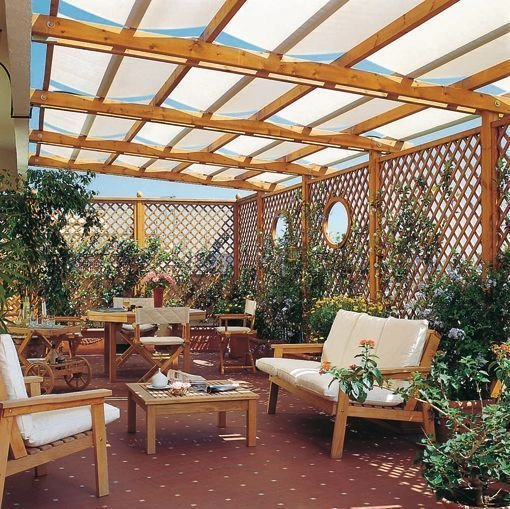 Una pérgola hecha con tablones de madera ofrece protección total contra el sol; pero para garantizar una buena impermeabilidad frente a la lluvia, habrá que sumarle una segunda cubierta con policarbonato o vidrio laminado.