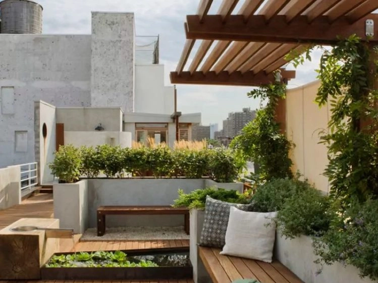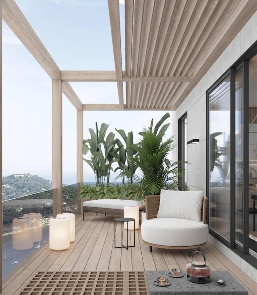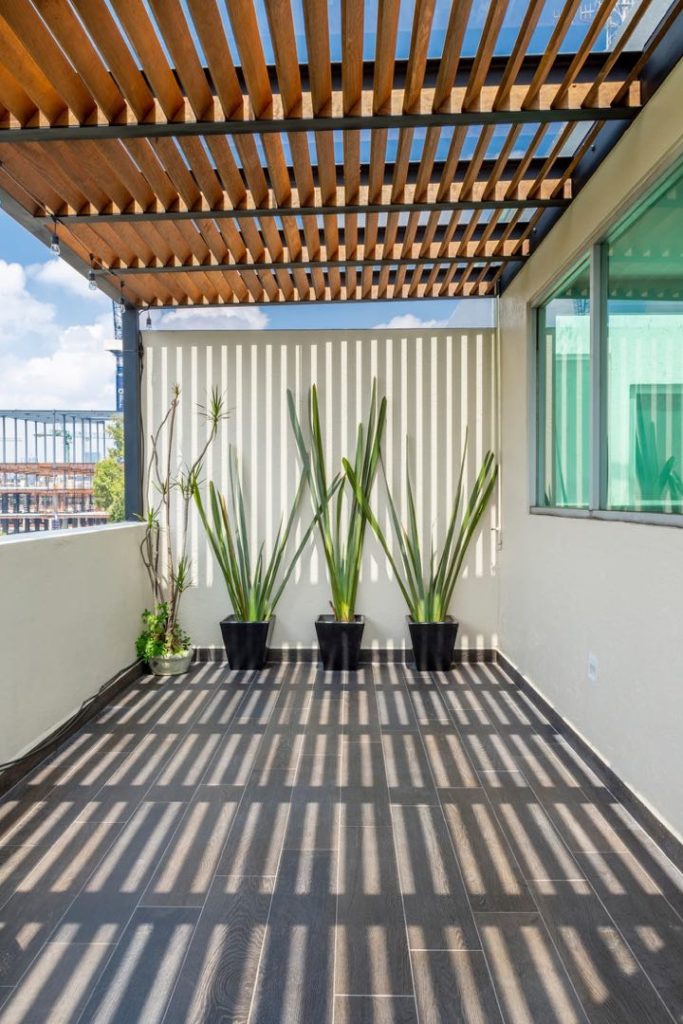 En esta propuesta, una estructura de material le da contención a unos tirantes de madera que forman la cubierta y regalan juegos de luces y sombras sobre una pequeña terraza con espíritu chill out.