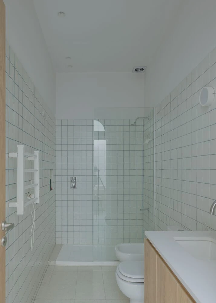 Las áreas húmedas se posicionaron discretamente detrás de una estructura de madera curva diseñada a medida. Simple pero elaborada con detalle, esta pieza sirve para delimitar las zonas de servicio del espacio central, aportando calidez y carácter.
